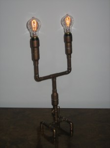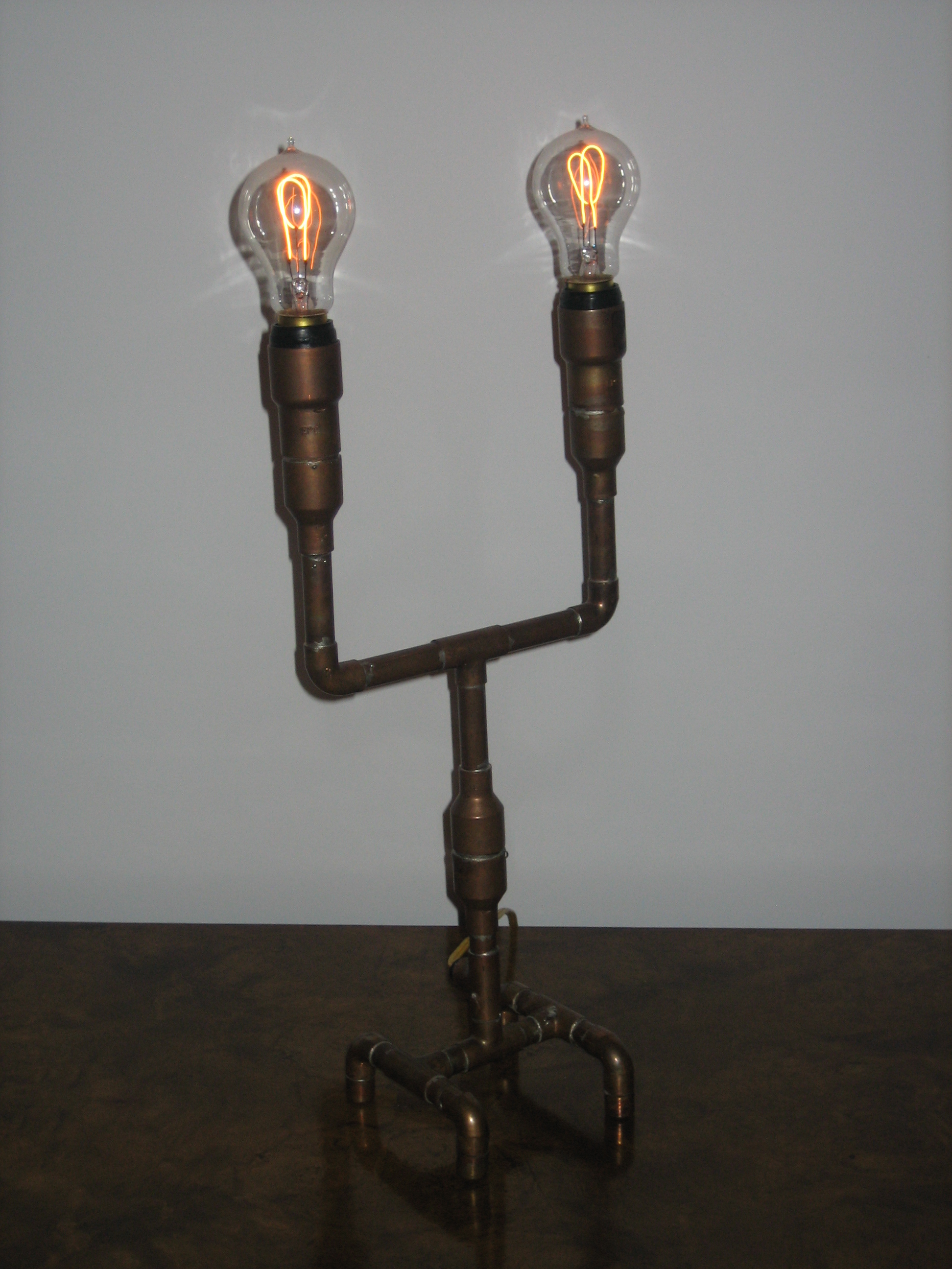 the design of this tall, two-bulb table lamp is simple yet sturdy. the lamp features a slide rheostat (dimmer) for a soft, romantic glow when needed. this one has vintage edison-style carbon filament bulbs.