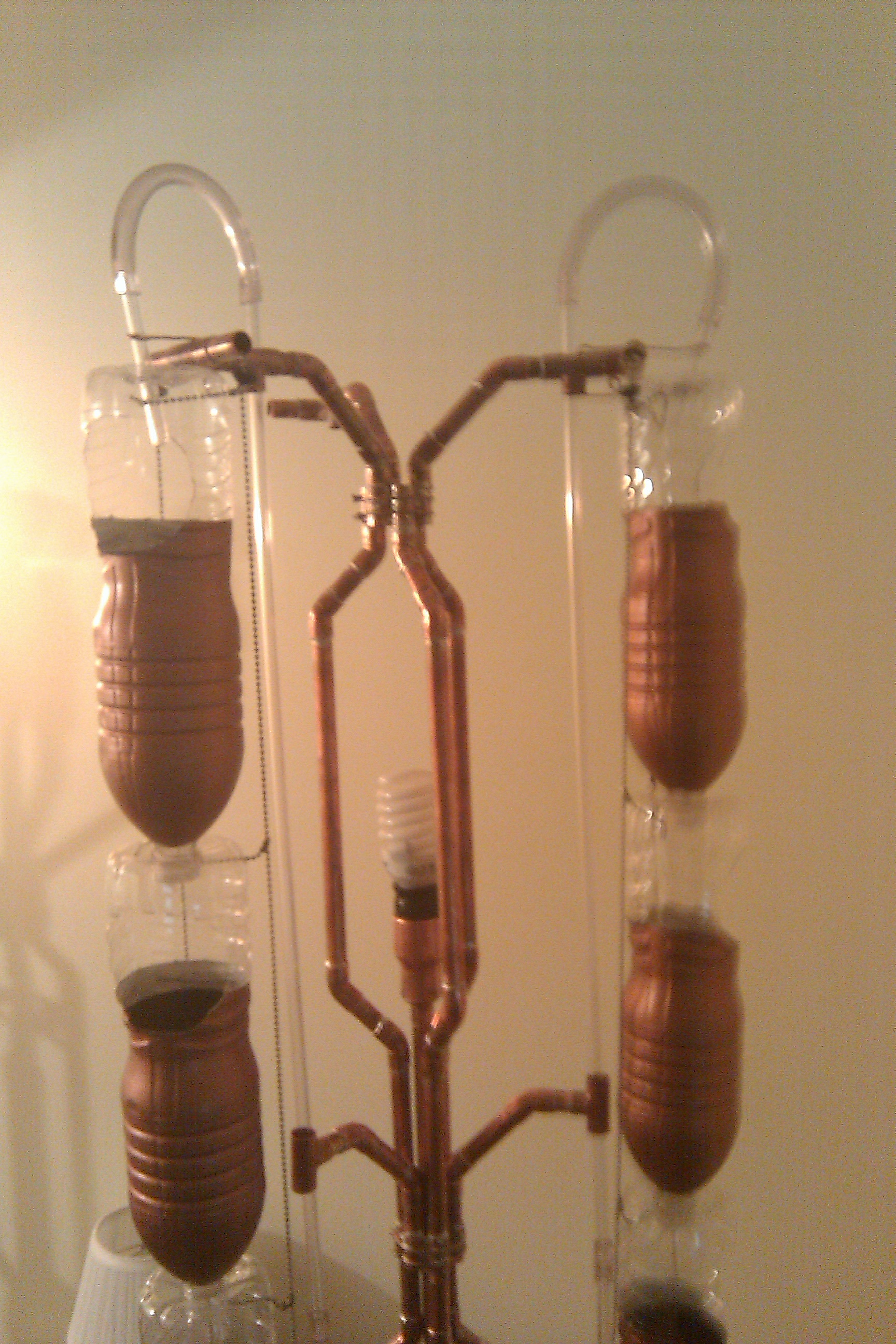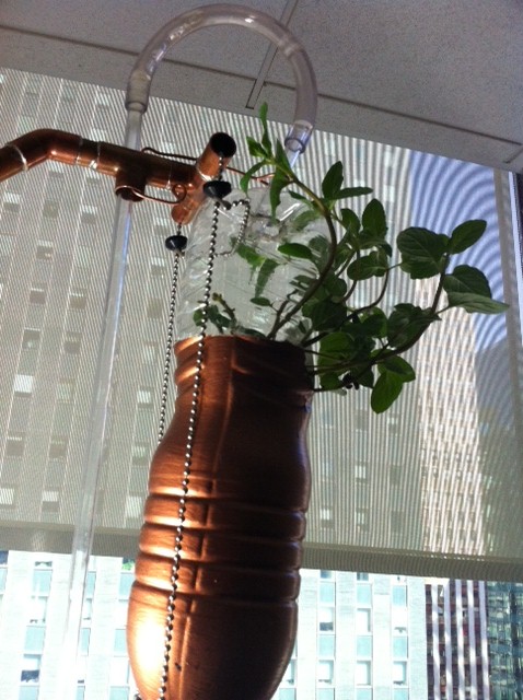 this project combines the warmth and beauty of aged copper with an indoor urban garden. the hydro-tower features 8 planting pots, an air-pump water circulation system, and two 100 watt cfl grow lights. it uses the hydroponic system developed by windowfarms.org.